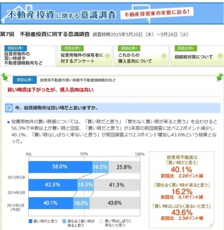 野村不動産アーバンネット株式会社(本社:東京都新宿区/取締役社長:宮島 青史)は、2015年5月20日~5月26日、投資用不動産サイト「ノムコム・プロ」(http://www.nomu.com/pro/)の会員を対象とした「不動産投資に関する意識調査(第7回)」を実施いたしました。この度、調査結果がまとまりましたのでお知らせいたします。