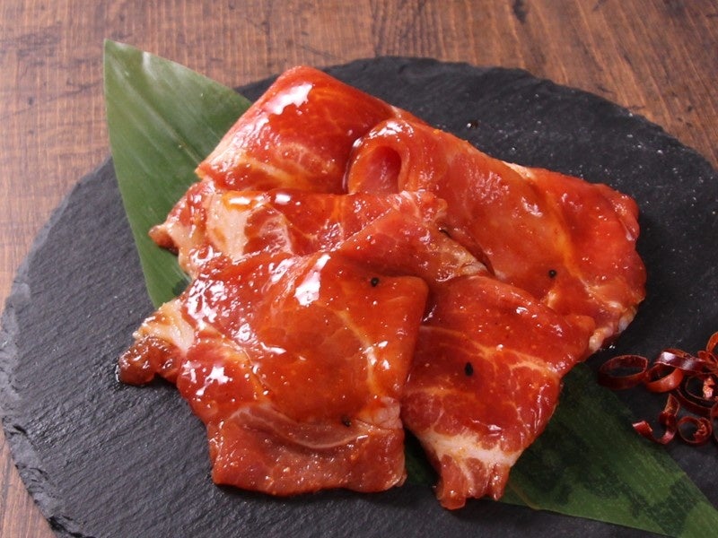 自社開発した特製ピリ辛ダレでコーティングした焼肉です。ピリッとHOTで甘味のあるタレがあと引く旨さ!是非お店でご賞味ください。