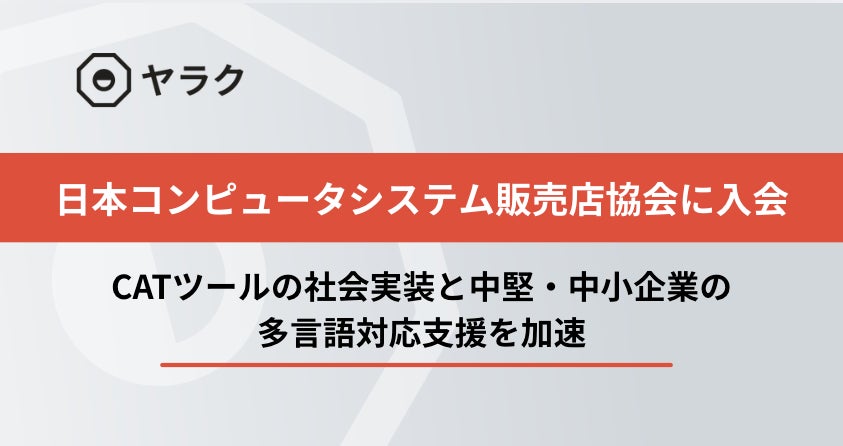 生成AIを搭載した翻訳支援ツール(CATツール*)「ヤラク翻訳」を提供する八楽株式会社(本社:東京都渋谷区、代表取締役:坂西優、以下八楽)は、2025年6月、一般社団法人日本コンピュータシステム販売店協会(本部:東京都千代田、会長:林宗治、略称:JCSSA)に正会員として加盟したことをお知らせいたします。今回の加盟により、IT業界における多言語対応の課題解決に向けた連携を強化するとともに、JCSSAが持つネットワークや情報基盤を活用し、CATツールの社会実装を加速させてまいります。