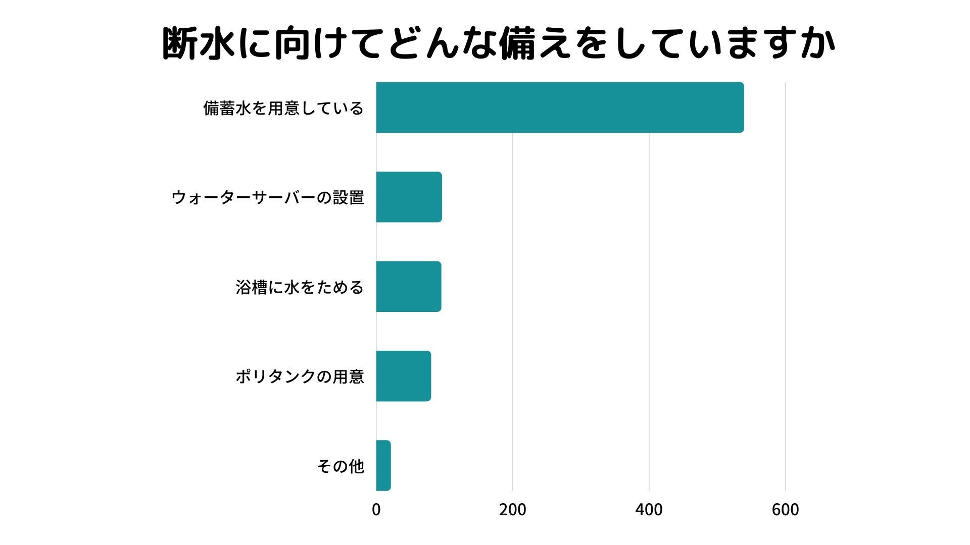 断水に向けて備えている家庭に、どんな備えをしているか調査した結果、「備蓄水の準備をしている」との回答が一番多い結果となりました。