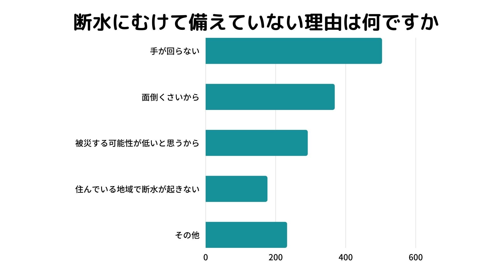 断水に向けて備えていない家庭に向けて、備えない理由を調査したところ、手が回らない、面倒くさいからといった、準備に対する手間に関する回答が多く寄せられました。