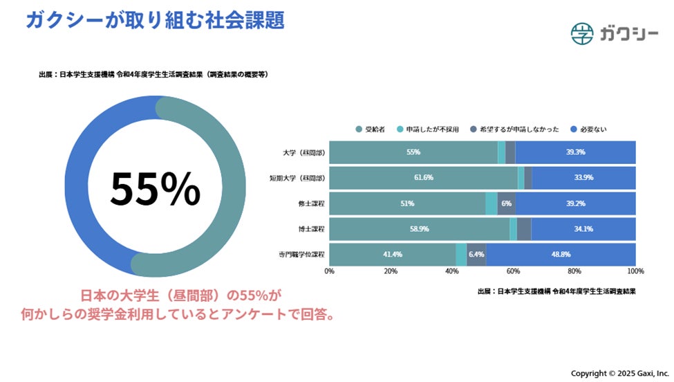 一方でガクシーは、国内最大級の奨学金プラットフォーム運営企業として、「諦めなくていい社会の実現」を目指し、情報格差の解消と新しいお金の流れの創出で奨学金の総量を増やす事業に取り組んでいます。