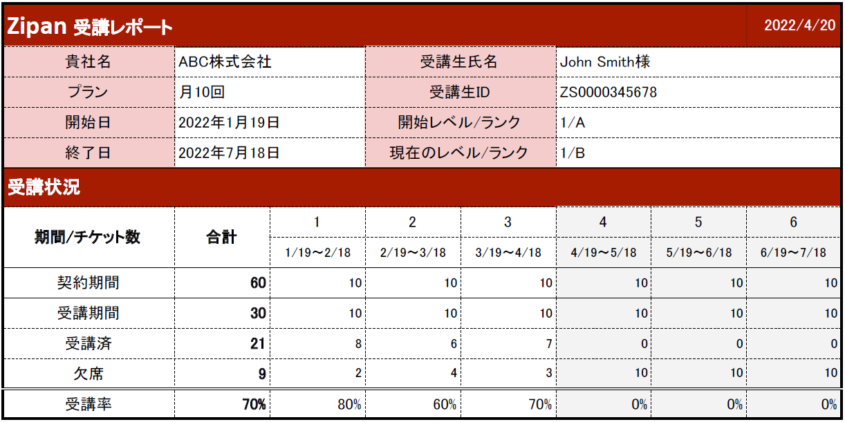 毎月の受講レポートで受講生の受講状況を可視化。受講率、学習内容、トレーナーからのフィードバックから受講生の状況を細かく把握することができます。