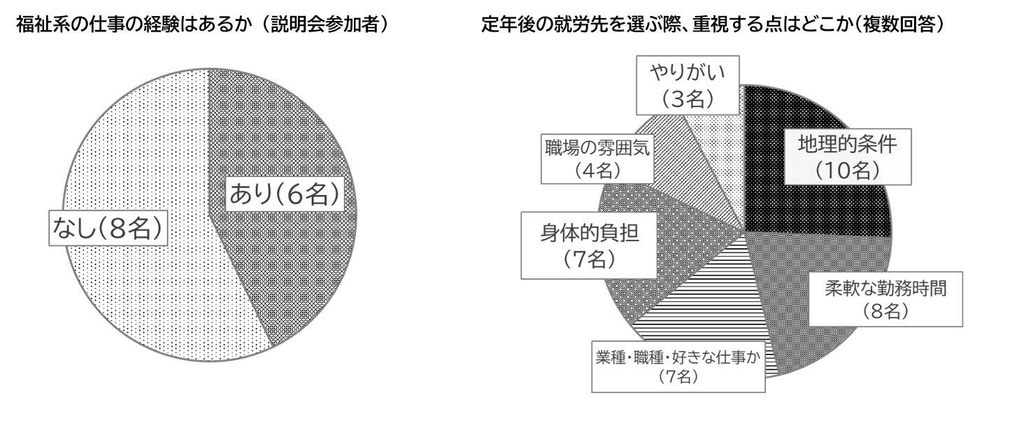 説明会参加者へのアンケートで、福祉系の仕事の経験では回答者の半数を超える8人が「経験なし」でした。定年後に就労先を選ぶ際には「柔軟な勤務時間」や「身体的な負担」を重視する人も多く、長く働き続けるためには、年齢を考慮した柔軟な業務調整も必要であると考えられます。