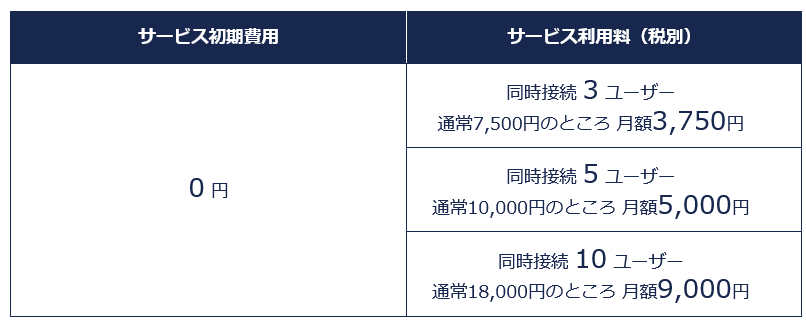 ※ご利用ユーザー全員が同時にアクセス可能な、通常ユーザーライセンスプランにつきましても、通常1ユーザーあたり月額1,600円のところ、月額800円(税別)のキャンペーン特別価格にて提供いたします。