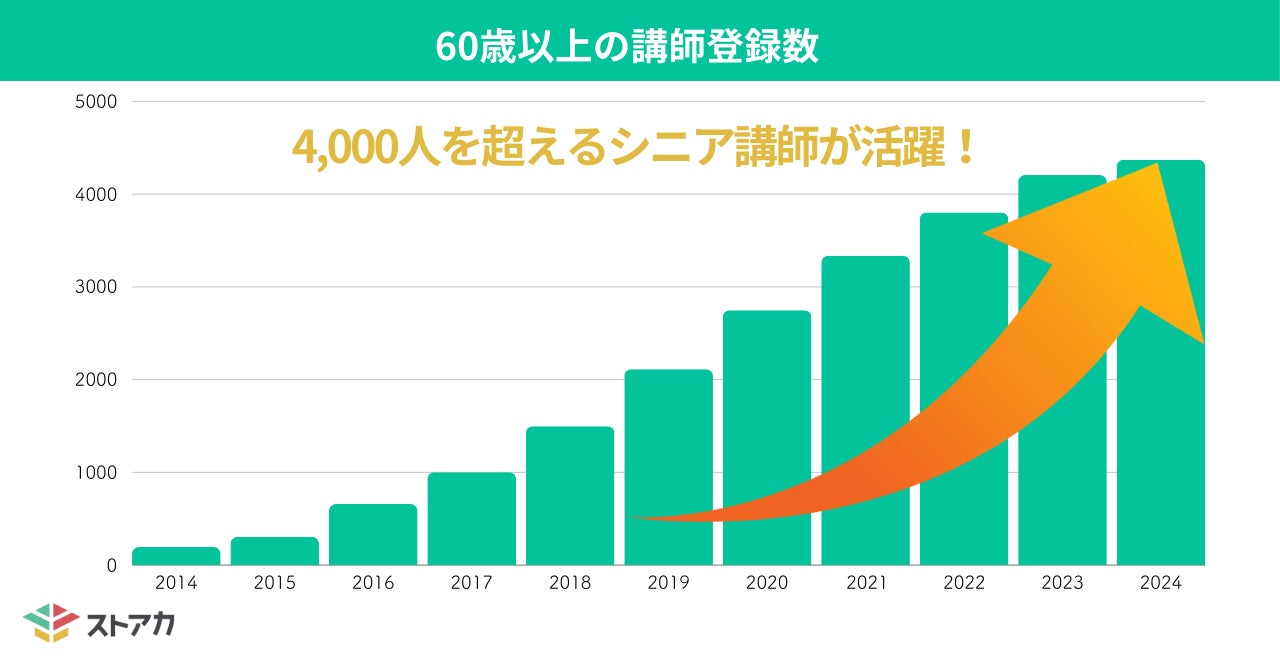 こうした中で、ストアカでは近年、約4,000人を超えるシニアの方々が自身の経験やスキルを活かして講師として活動しており、スキルシェアという新たな働き方が確立されています。特にシニア講師の数は5年前と比較して約5倍に増加しており、シニア層におけるスキルシェアへの関心の高まりが見て取れます。