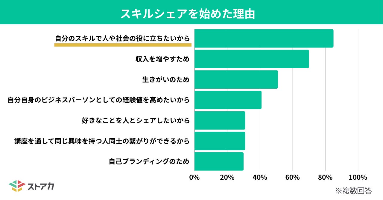 調査結果によると、シニアがスキルシェアを始めた主な理由は「自分のスキルで人や社会の役に立ちたい」と考えている方が全体の85%に上り、スキルシェアがシニア世代にとって社会貢献の場として機能していることが明らかになりました。また、「生きがいのため」(51%)といった理由も多く見られ、スキルシェアが単なる収入源の確保だけでなく、自己実現や社会とのつながりを深める手段となっていることが示されています。