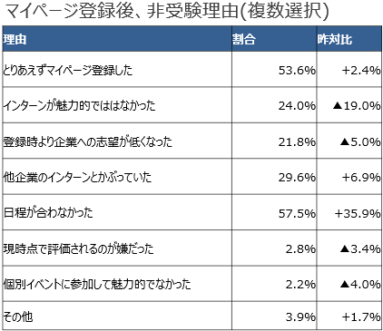 マイページに登録したものの、インターンシップに参加しなかった理由の第1位は、「日程の都合が合わず」で昨年比35%増