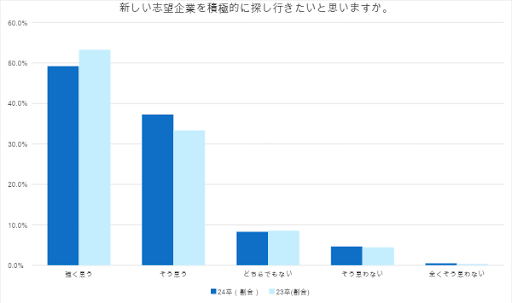 今後新しい志望企業を積極的に探したいかという質問に、「強く思う」「そう思う」と回答した学生は合わせて約87%
