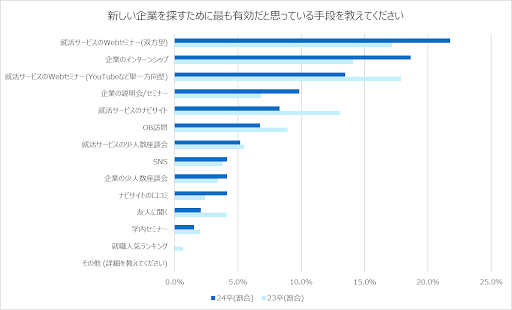 また、「新しい企業を探すために最も有効だと思っている手段」としては、「双方向型セミナー」や「インターンシップ」の回答が多いという結果となり、いずれも昨年より増加している。今後、学生が新しい企業を探していく際に、新しい企業を『知る』よりも、双方向にコミュニケーションを取ることで企業と『語り合う』事に対する学生の需要が高まっている結果となった。