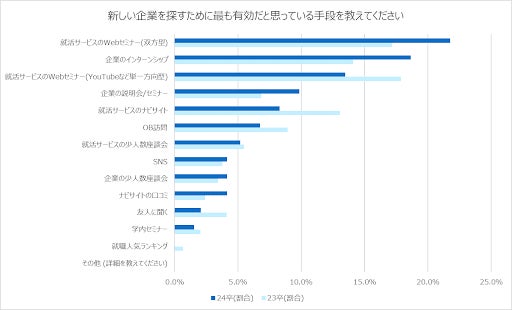 新しい企業を探すための手段として企業との双方向のコミュニケーションを有効と考えている傾向。(最も有効だと思っている手段の第1位は、「双方型就活サービスのWebセミナー」で約22%)