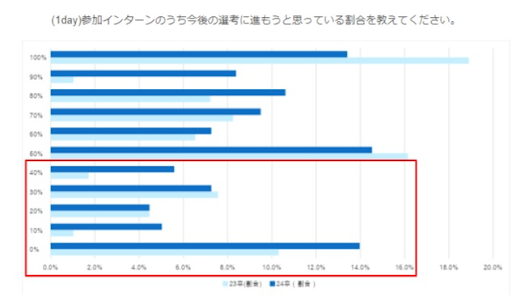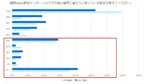 1dayインターンに参加した学生の、「今後の選考に進もうと思っている割合」は、23卒と比べて、選考意向率(=インターンに参加した企業のうち、選考に進もうと思っている企業の社数の割合)が40%以下の調査対象学生に占める学生の割合が1%から7%と上昇。一方で、選考意向率100%(=インターンに参加した企業は全社選考に進もうと思っている)の学生の割合が19%から13%に減少した。業界研究のためにインターンに参加したものの、意向度が上がってない層が増えている。また、複数daysインターンについても、今後の選考に進もうと思っている割合が50%以下の学生が43.6%と、高い離脱率になることが予測される。