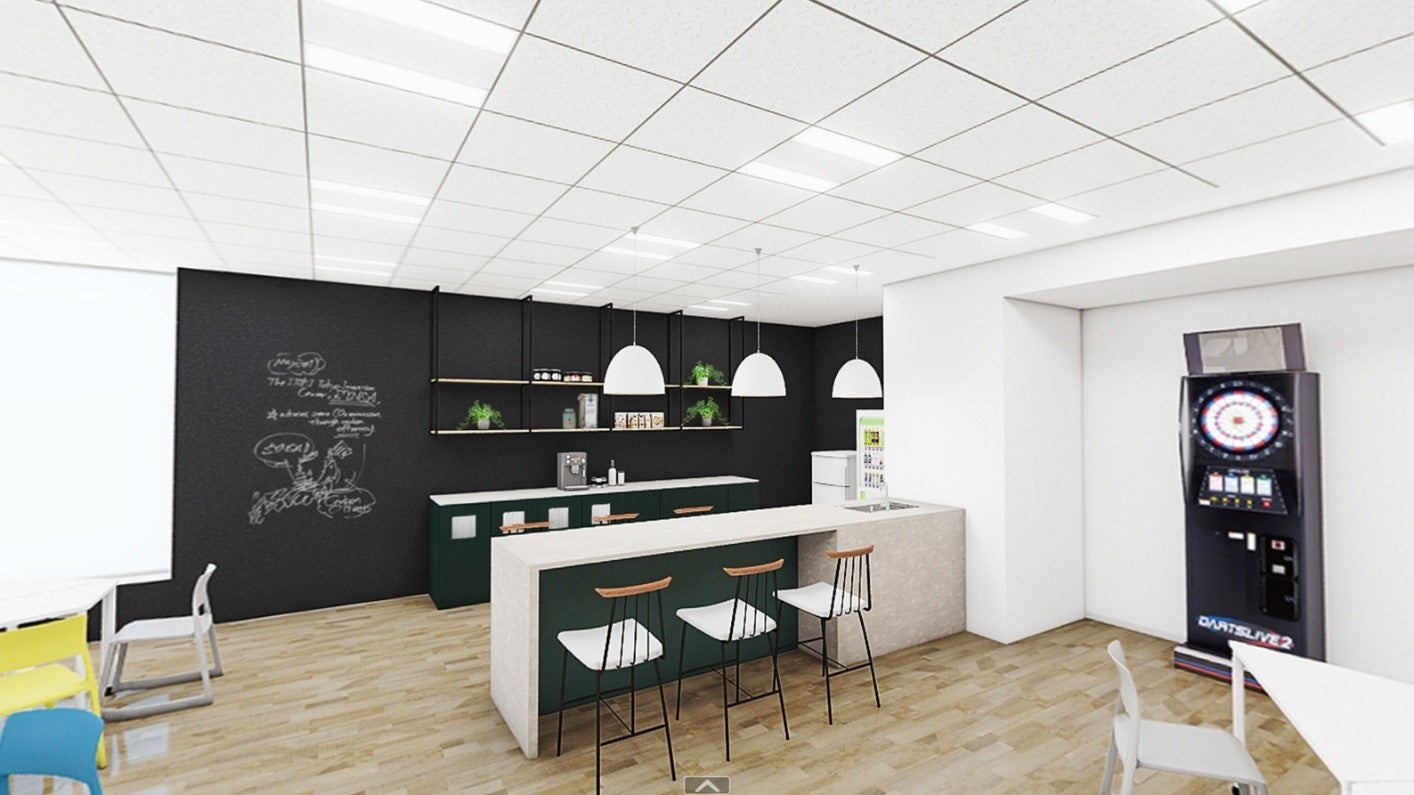 レセプションスペースにおいては、現オフィスにて好評であったキッチンを設け、社員同士が気軽にコミュニケーションできる空間を設けております。ここには『Mamoru PUSH』の日米特許技術であるワンタイムQR認証機能が採用されている最新のダーツマシン設置します。