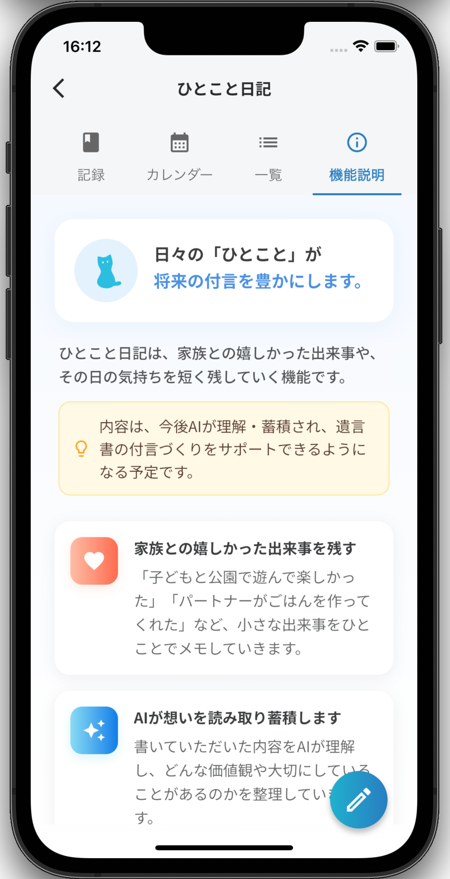 記録した日記は蓄積され、今後AIにより遺言書草案の付言(※)づくりをサポートできるようになる予定です。