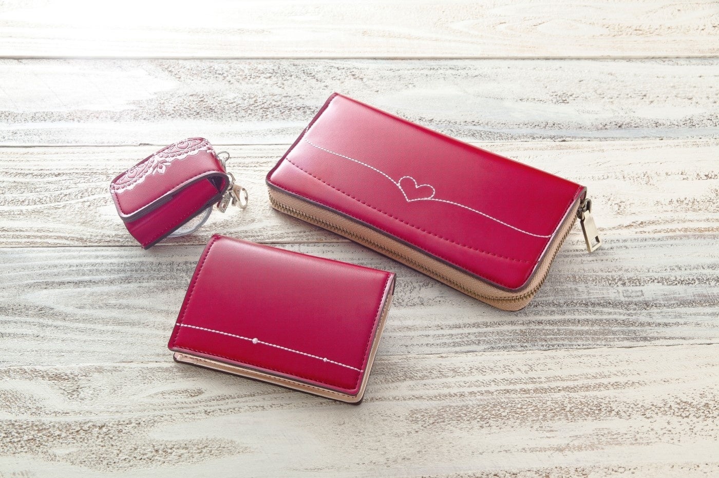 ランドセルの刺しゅうやパーツを活かしながら、「ラウンド型長財布」「折財布」「キーホルダー (ミニミニランドセルキーホルダー、またはベルトキーホルダー)」3点のグッズにリメイクします。