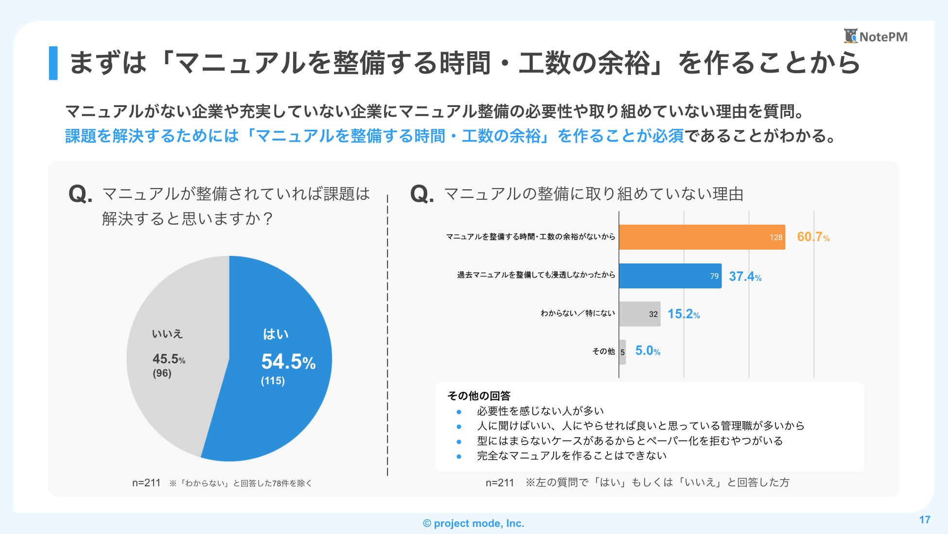 マニュアルが活用できていない理由について「マニュアルが整備されていれば課題は解決する」と考えている方は54.5%。マニュアル整備に取り組めていない理由は「マニュアルを整備する時間・工数の余裕がないから」が60.7%となっておりました。