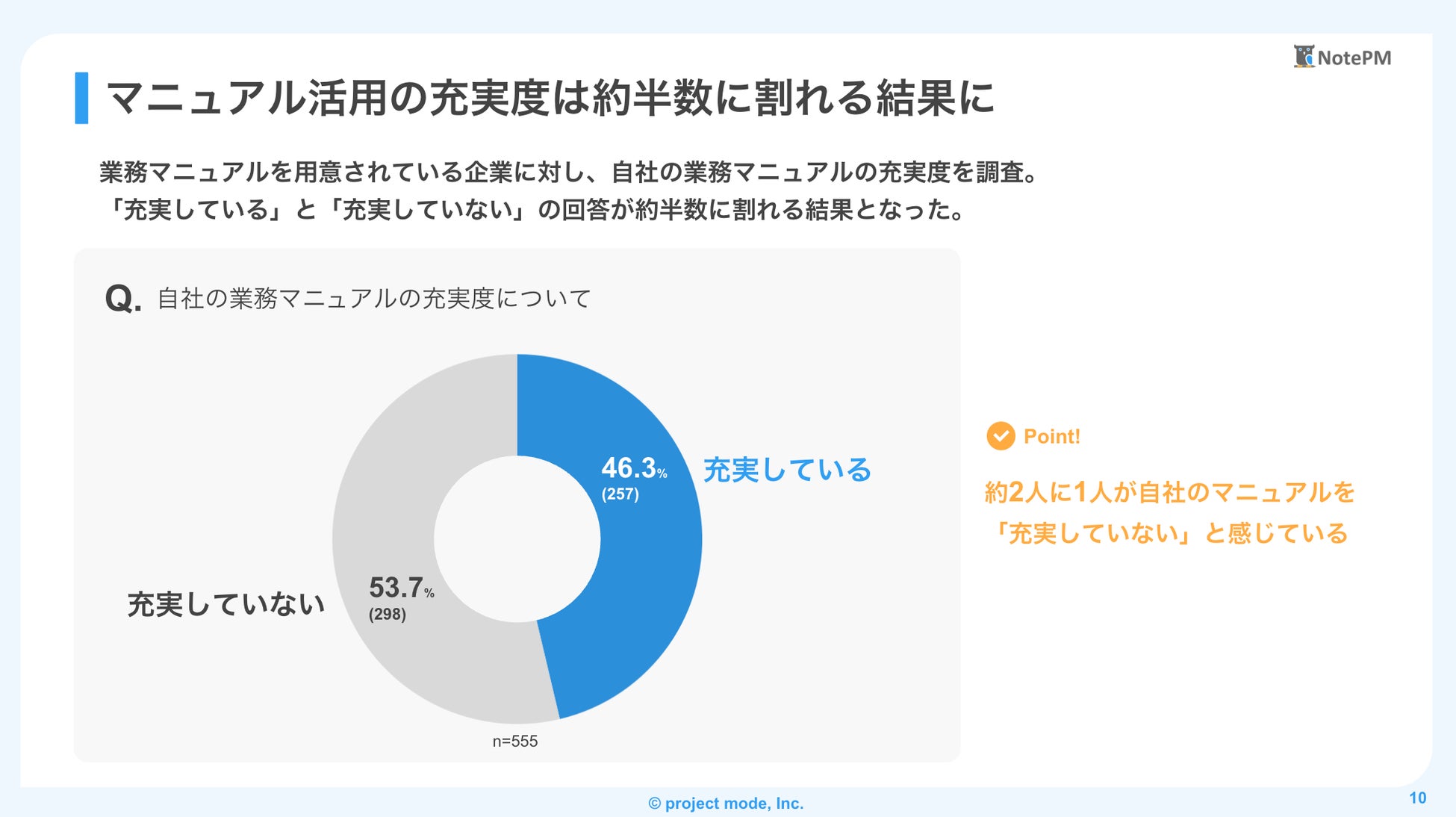 マニュアルが用意されている企業に対し、マニュアル活用の充実度を調査すると「充実している」と回答した方が46.3%、「充実していない」と回答した方が53.7%と、半数以上の企業がマニュアルの充実度に課題を抱えていました。