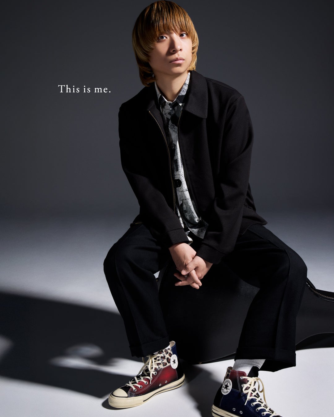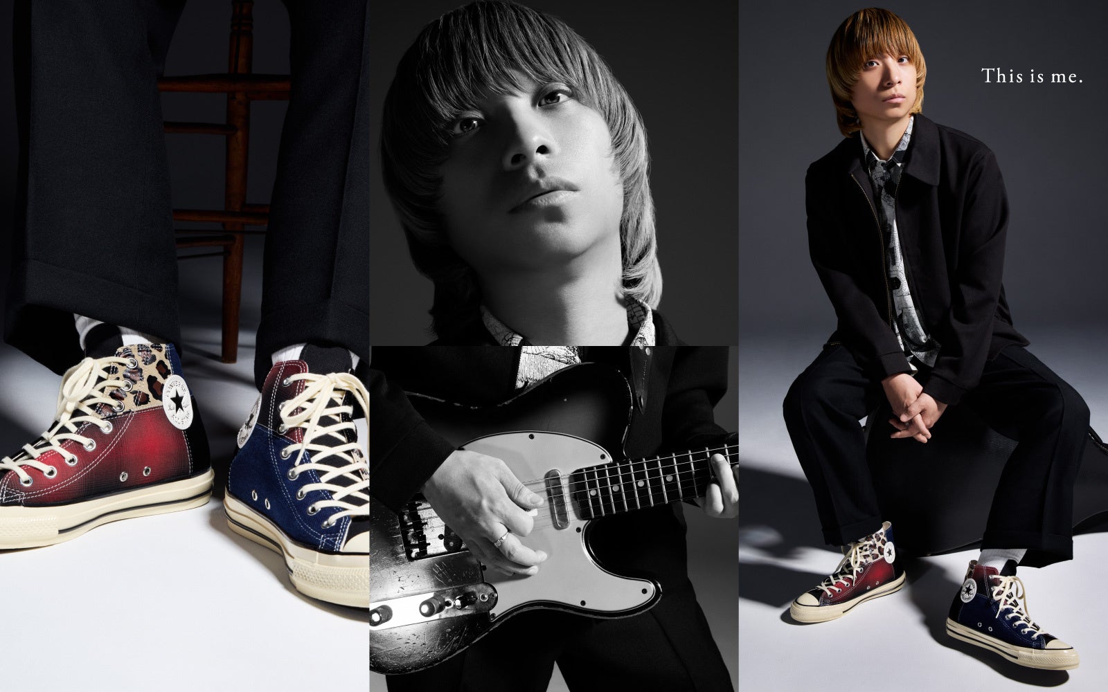 今回は、90年代グランジカルチャーにインスパイアされた異素材ミックスのモデル「ALL STAR AGED MATERIALBLOC HI」とともに、「This is me.」の世界観を、ファッションを始め様々なポートフォリオ撮影を手掛けてきた操上 和美氏に撮影していただき表現。尾崎氏ならではの視点や感性、紡がれる言葉と佇まいなどを操上氏のフィルターを通しグラフィックに深みをもたらしています。文学的で内省的な表現と、音楽で見せる激しさ、その相反する魅力を併せ持つ尾崎氏が、「自らの選択で立ち続けること」の価値を語る。本コンテンツは、「ALL STAR AGED MATERIALBLOC HI」がもつ“ネオグランジ”というキーワードを体現する内容に。