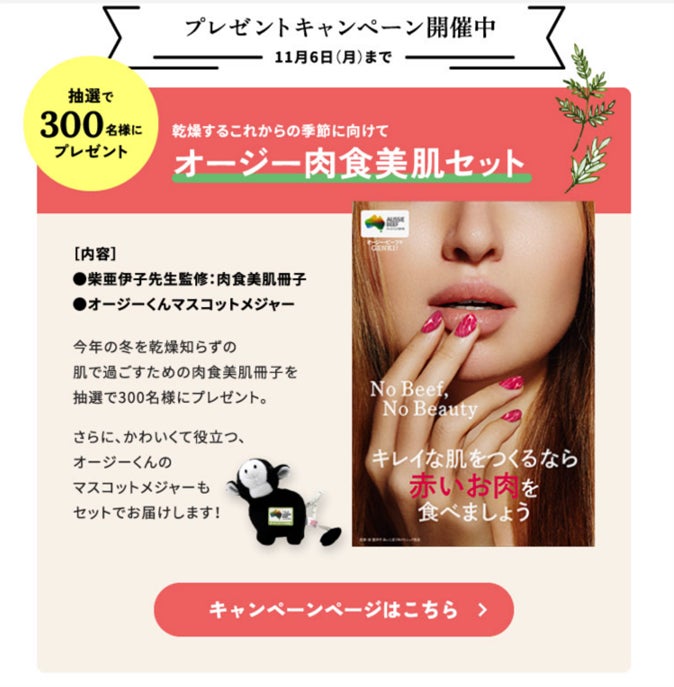 内容: 抽選で300名様に、肉食美肌小冊子、オージーくんマスコットメジャー等のセットをプレゼント