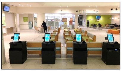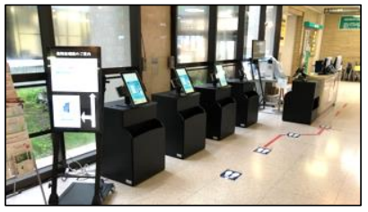AIを搭載した顔認証付きの診察システム。患者様は事前に各種登録を済ませば、受付や精算などをスムーズに行うことができ、‟手ぶら受付“が可能です。このシステムにより、外来業務の効率化を図ることができます。