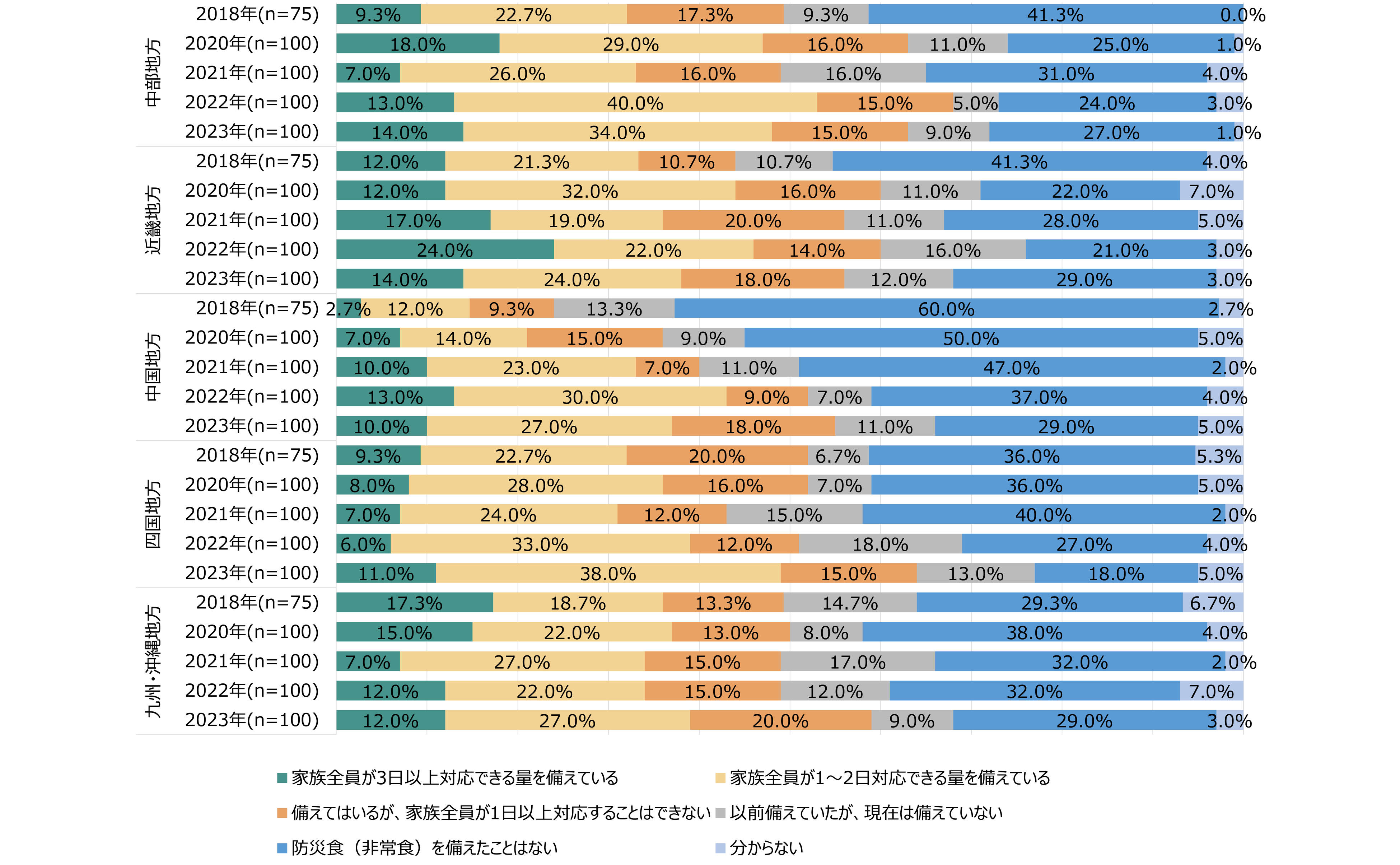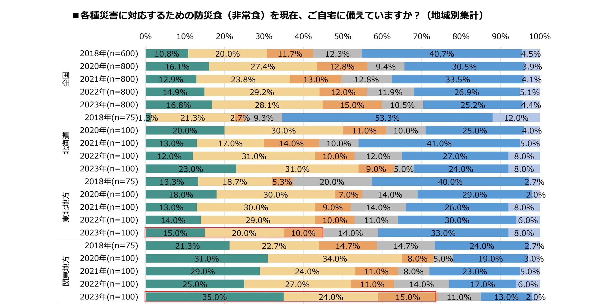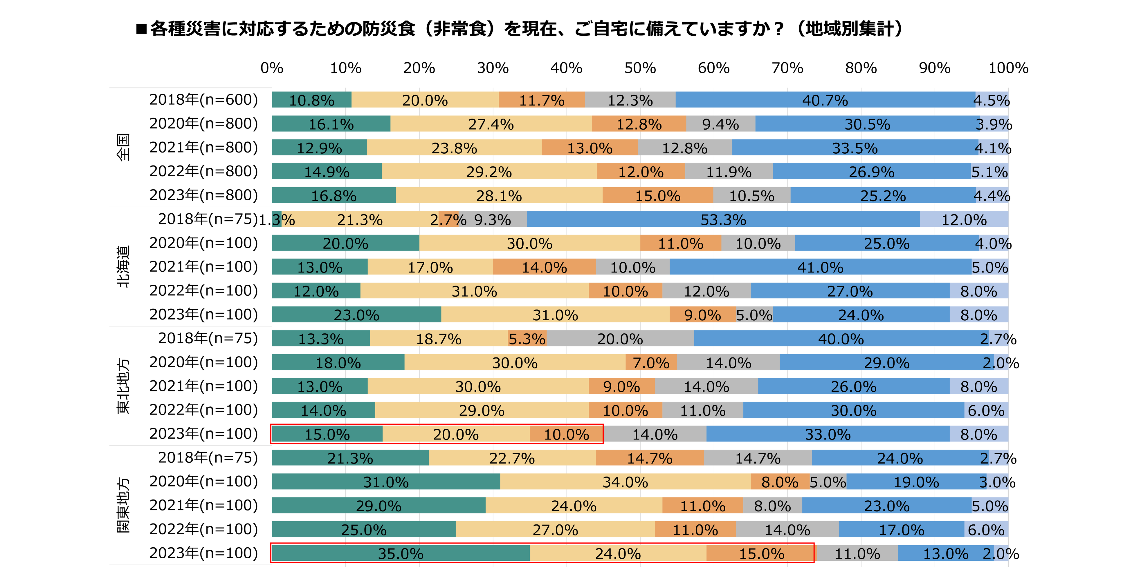 - 地域別備蓄率は関東が最多の74.0%、東北地方が最も低く45.0%