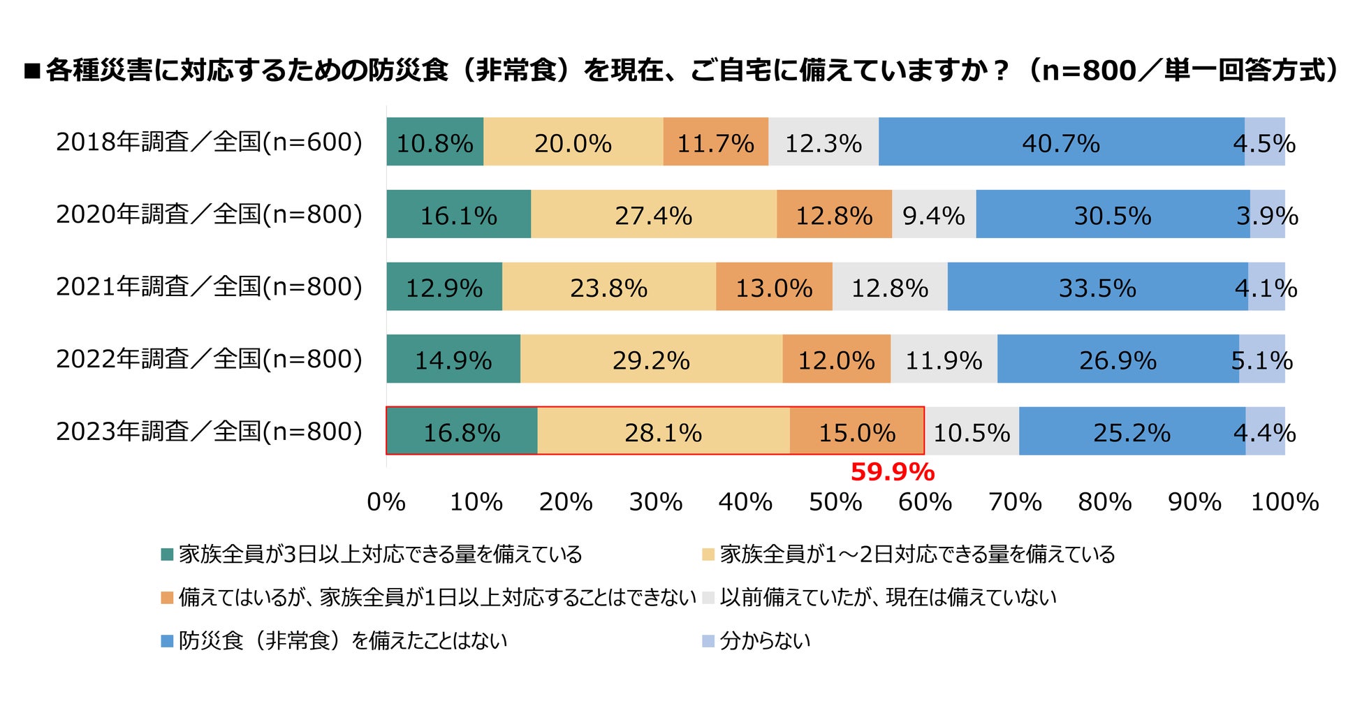 - 防災食(非常食)の備蓄率は59.9%、3年連続で増加