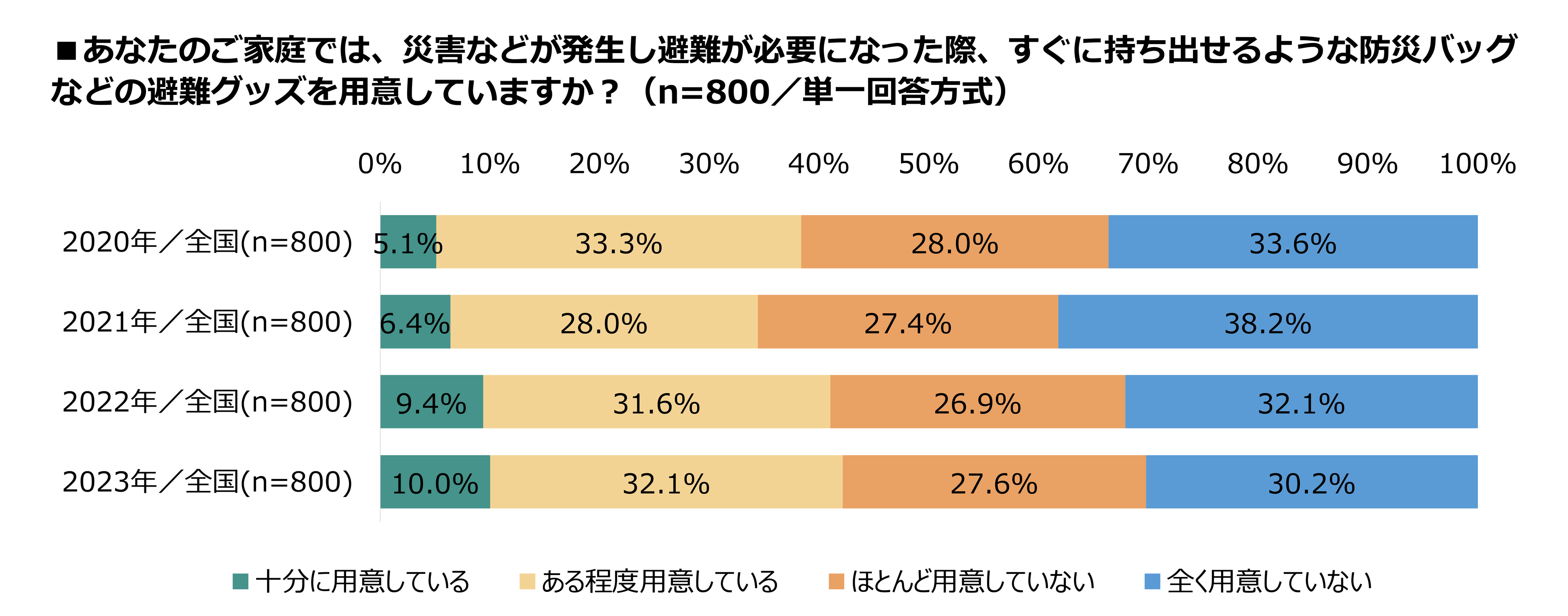 一方で「ほとんど用意していない」と回答した方は27.6%で、「全く用意していない」と回答した30.2%と合わせると57.8%と、半数以上の家庭で防災バッグなどの持ち出し用の防災バッグが用意できていない状況も分かりました。