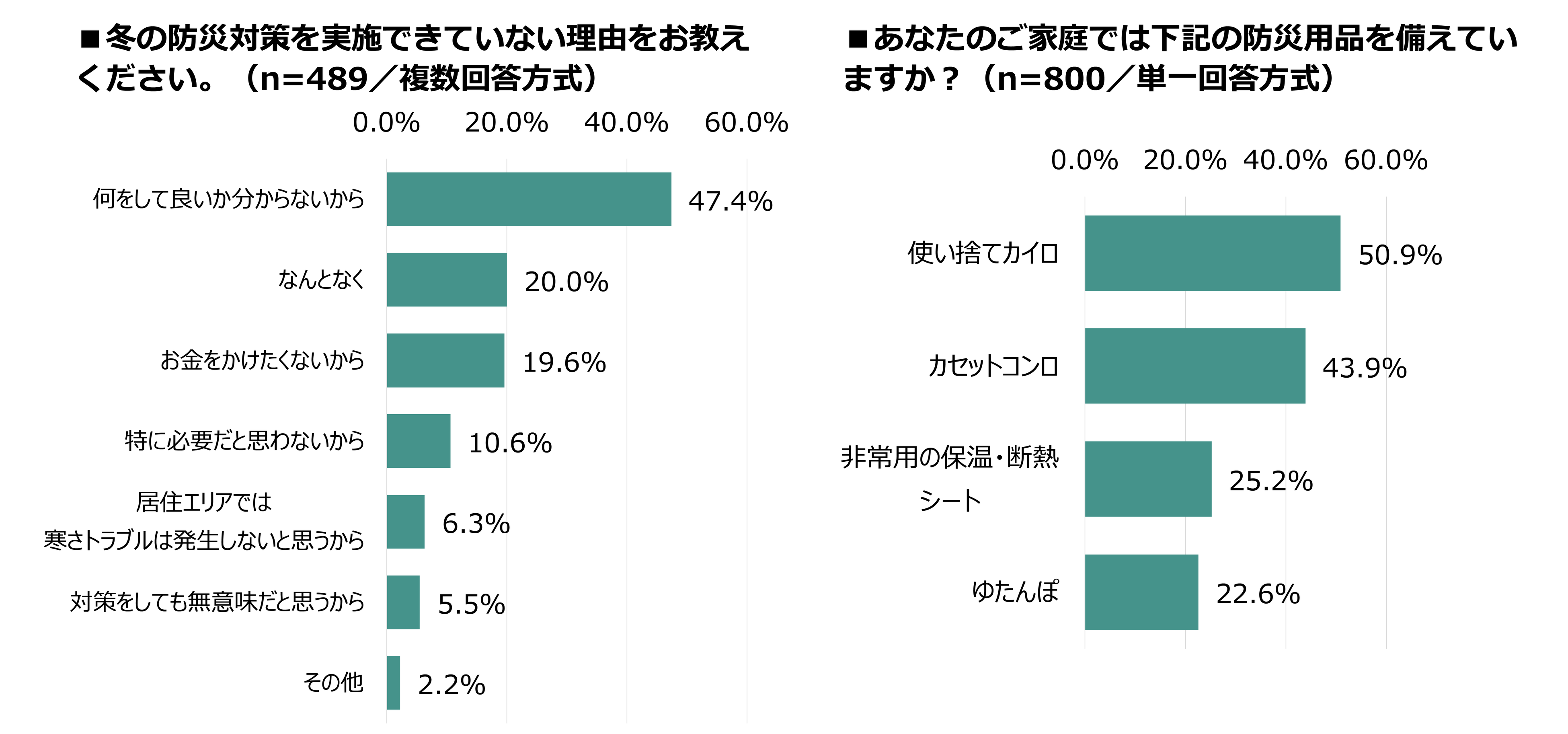 実際に防寒対策として「保温・断熱シート」を備えている方は25.2%にとどまるなど、つい忘れてしまいがちな冬の寒さ対策も重要な課題として残る結果となりました。