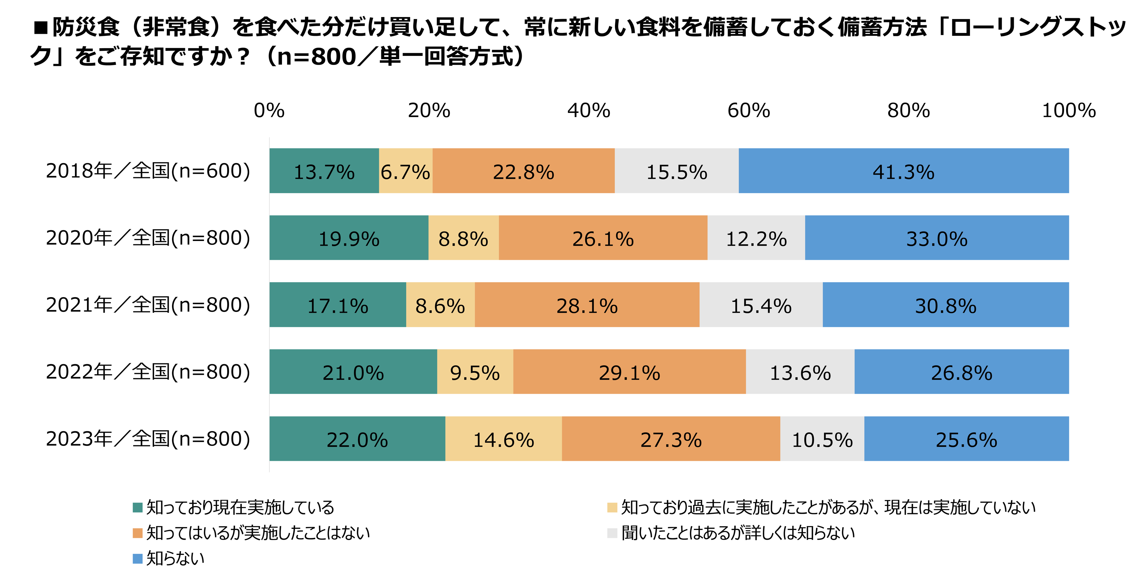 今回の最新調査では、防災食(非常食)の備蓄率は59.9%と、2018年の調査開始から過去最高となりました。また防災食(非常食)を食べた分だけ買い足し、常に新しい食料を備蓄しておく備蓄方法「ローリングストック」の実施率は、過去最高の22.0%という結果となりました。