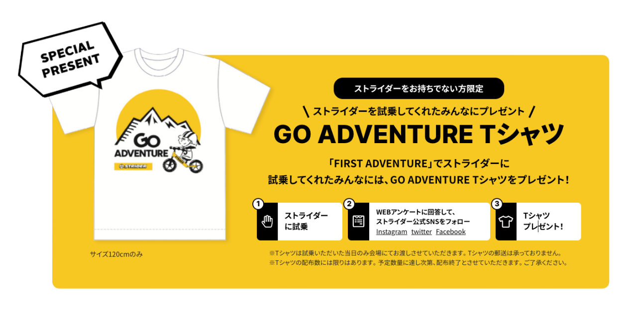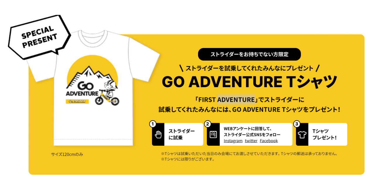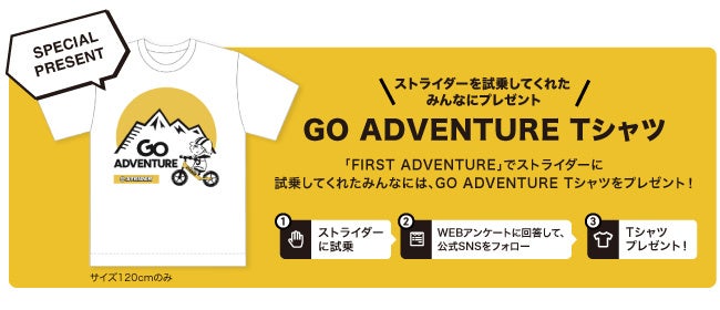会場でストライダーに試乗していただいたお子さまには、ストライダーをお持ちでない方限定で「GO ADVENTURE Tシャツ(非売品 / サイズ120のみ)」をプレゼントいたします。当日会場にてWEBアンケートにご回答いただき、ストライダージャパン公式SNS(twitter、instagram、facebookのうちいずれかひとつ)へのフォローが必要となります。