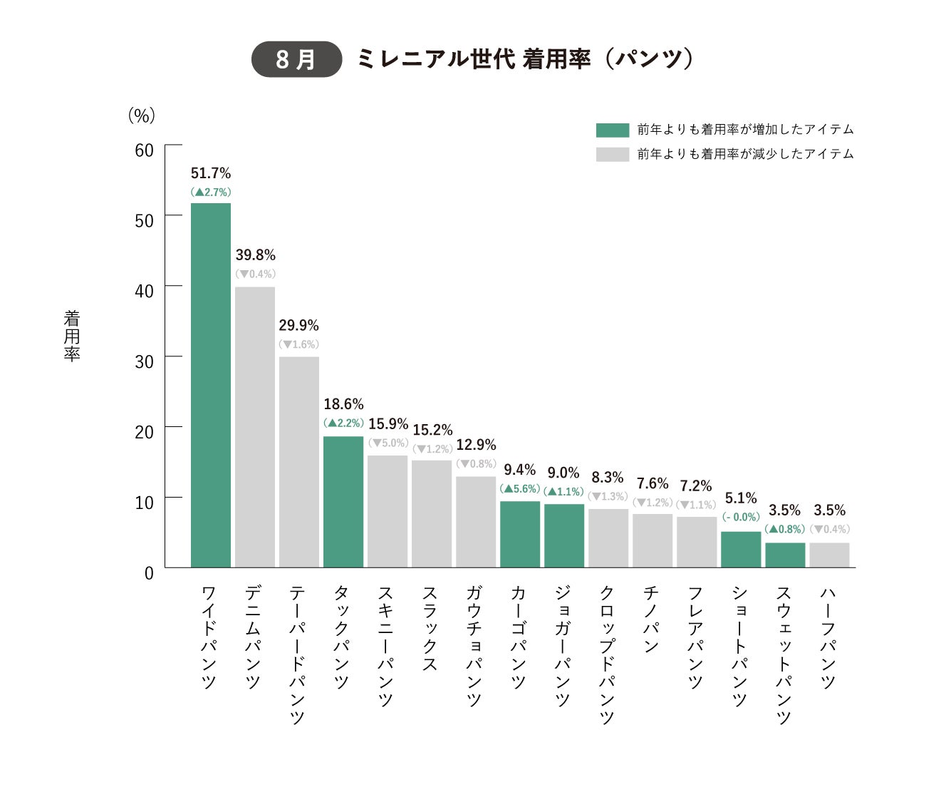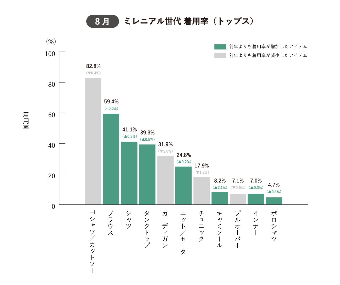2023年8月は「Tシャツ/カットソー」の着用率が82.8%となりミレニアル世代女性の約5人に4人が着用している中、Tシャツばかりのコーディネートにならないよう様々なトップスの着用率が前年同時期と比較して増加しました。エアコンや紫外線対策など夏の羽織りアイテムとして例年需要のある「カーディガン」の着用率は前年同時期と比較して▼2.0%減少しました。