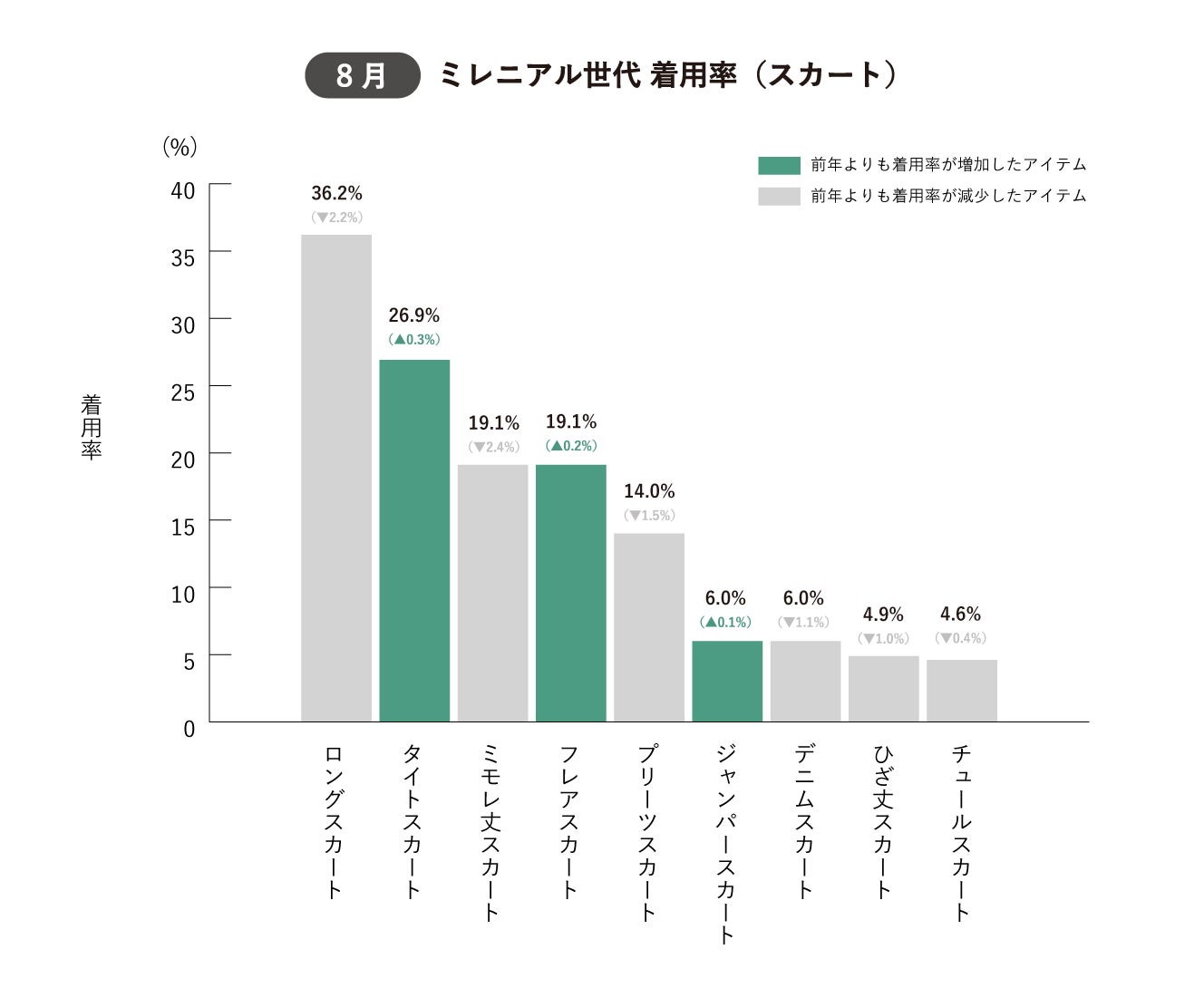 スカートの場合は、丈が長い「ロングスカート」の着用率が36.2%と最も高く、次いで「タイトスカート」の着用率が26.9%となり、ミレニアル世代女性の約3人に1人が着用していました。2023年8月に着用率が大幅に増加したスカートは無く、その一方で着用率が減少しているスカートが多いことから、スカートの出番が少なかったことが分かりました。