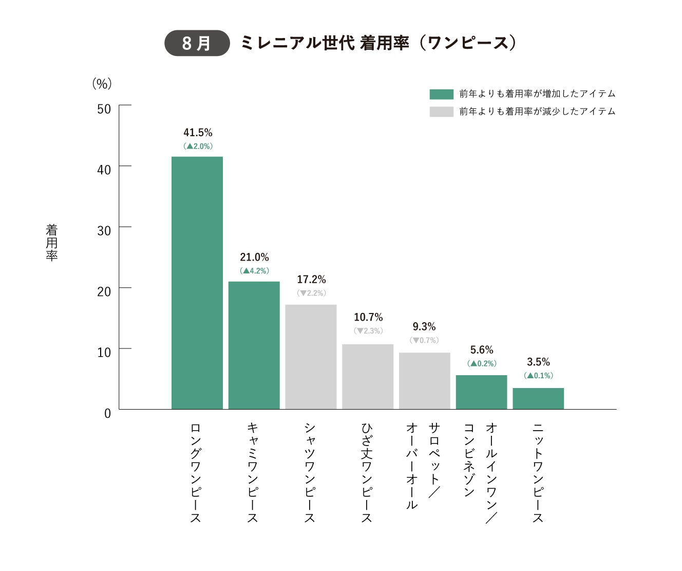 スカートと同様に、ワンピースの場合も着丈が長い「ロングワンピース」の着用率が41.5%と最も高く、ミレニアル世代女性の約2.5人に1人が着用しています。2023年8月は、ワンピースの中にトップスを重ねることで様々な着こなしを楽しむことができる「キャミワンピース」の着用率が前年同時期と比較して▲4.2%と大幅に増加しました。
