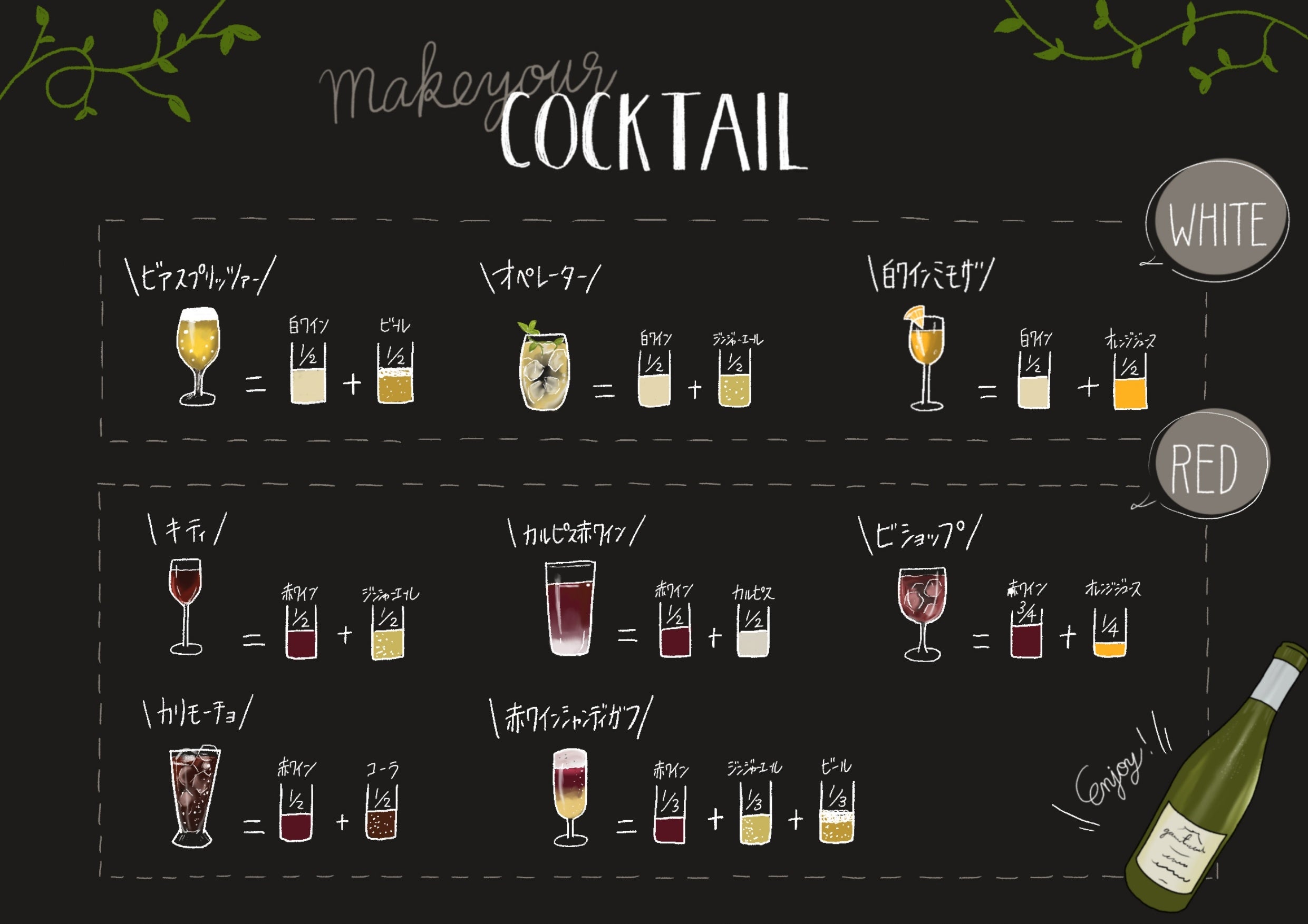 また、 ジンジャーエールやオレンジジュース等お好きなドリンクをワインと掛け合わせて、自分好みのカクテルを作ることができます。