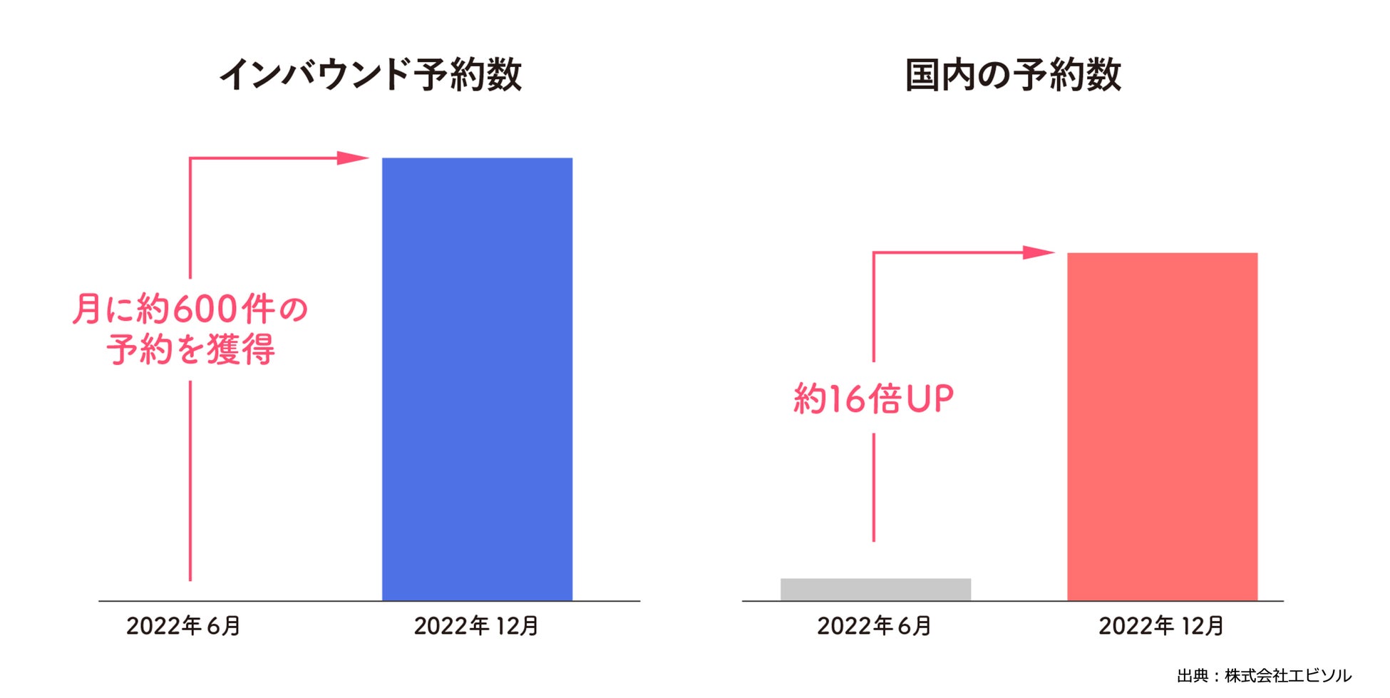 「ebica」導入とあわせて、自社サイトはもちろん、GoogleやInstagramといった予約導線を強化した結果、まず「Googleで予約」が訪日外国人の方からの主要導線となり予約数増加につながりました。さらに、「Googleで予約」を除いた主に国内からのネット予約数も、「ebica」導入時から6か月で約16倍に増加しました。こうした取り組みによって、2022年12月には、約8割が手数料のかからないオウンドメディアからの予約となり、課題であったDR比率が大幅に向上しました。