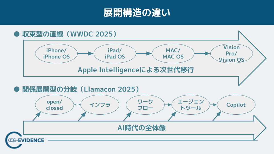 【図の見方】上:WWDC2025型「収束型の直線」、下:LlamaCon 2025型「関係展開型の分岐」を概念図で示します。