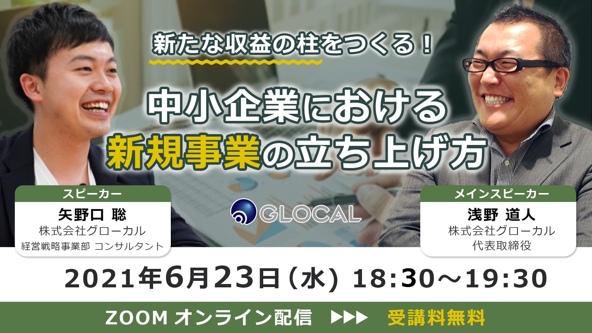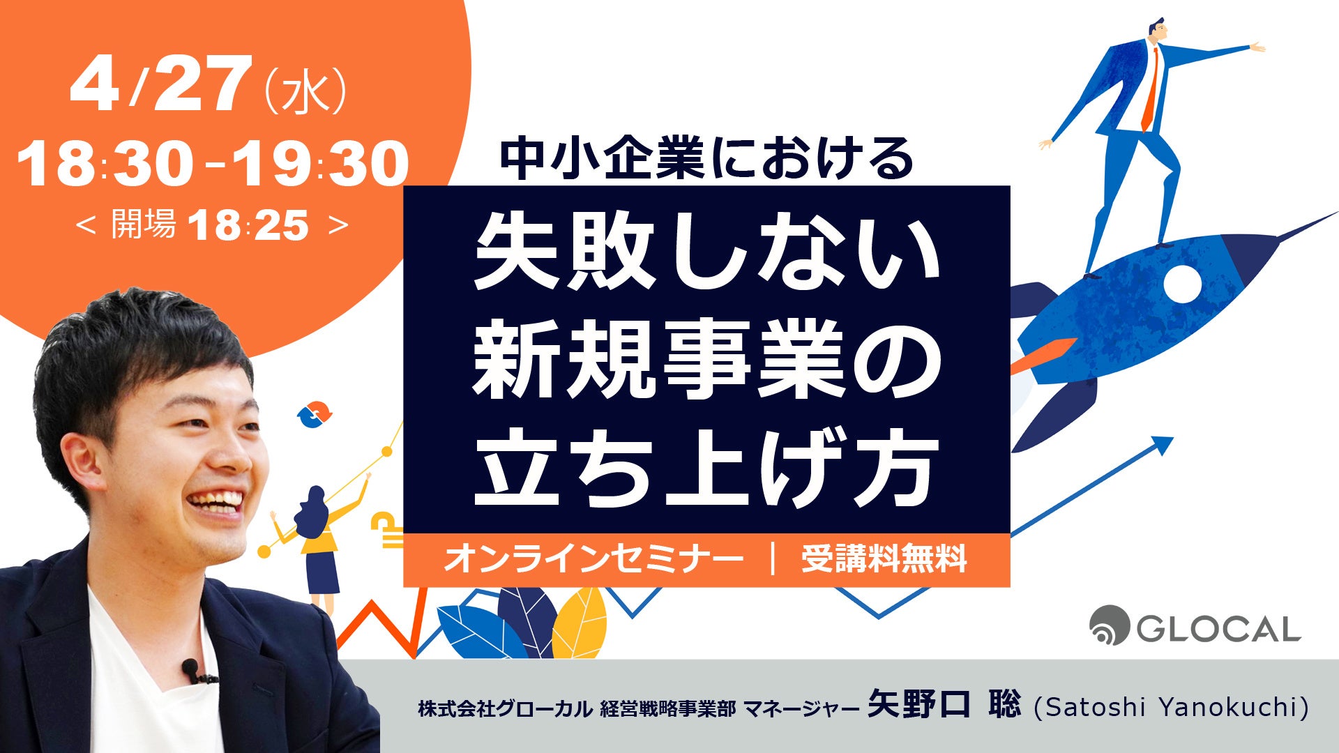 地域の中小・中核企業を対象に経営コンサルティング事業を行う株式会社グローカル(東京都渋谷区、以下グローカル)は、中小企業の経営者や事業責任者を対象に、限られたリソースで新規事業を立ち上げる時のポイントついて解説する無料オンラインセミナーを、2022年4月27日(水)18:30から開催します。