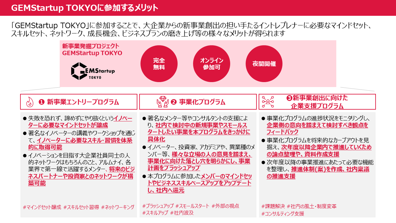 民間企業のリソースを活用し、東京都内で起業や新事業を創出したい方にご応募いただけます。完全無料、オンライン参加可、夜間開催のプログラムですので、ご興味をお持ちの方はぜひこの機会にお申込みください。