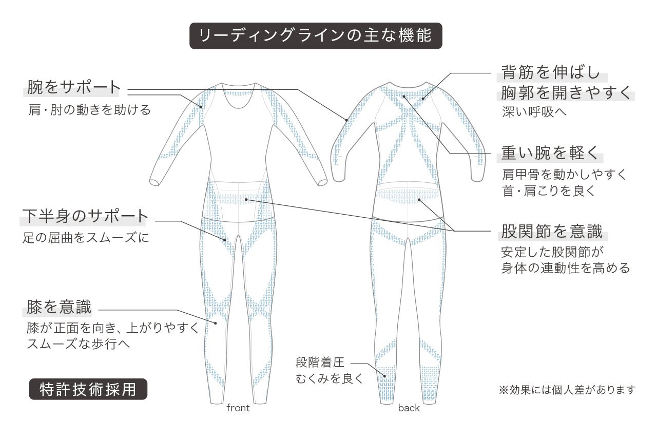 伸縮性のある特殊樹脂プリントによって生み出されたリーディングラインが筋肉や関節の動きに沿い、適度な着圧で身体の動きを適切な範囲に保ちます。肌側にプリントされたリーディングラインが直接肌にふれ、筋肉や関節が刺激されることで、その部分を意識することができます。また、動きやすいように身体のフォルムに合わせた3D形状によって、美しく上手な身体の動かし方を意識できるようになります。