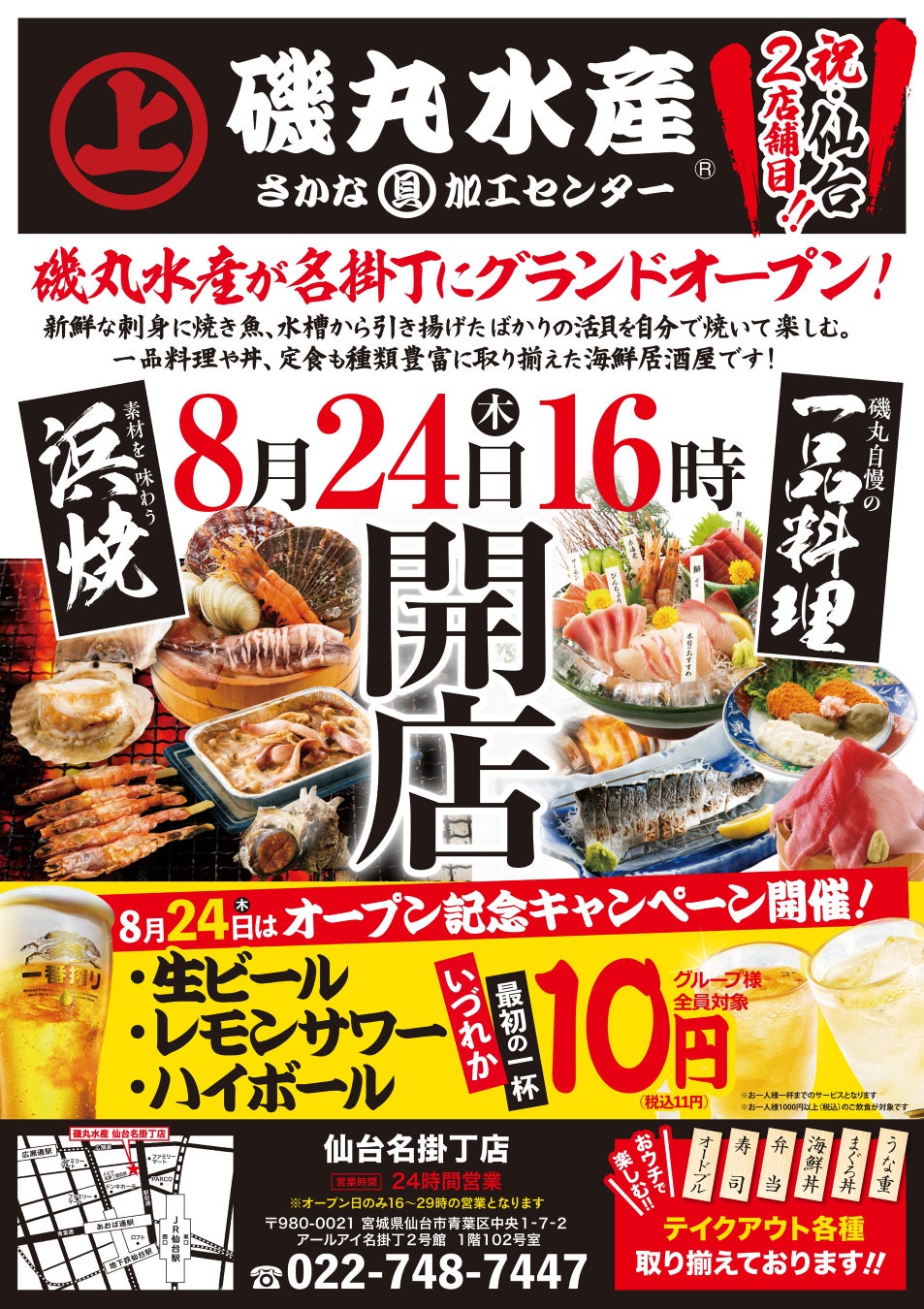 2023年8月24日(木)16:00 仙台に2店舗目「磯丸水産 仙台名掛丁店」がオープンします!