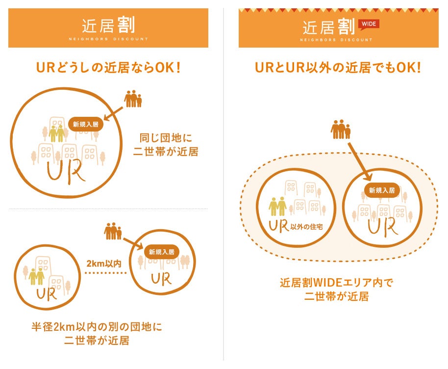 UR都市機構(独立行政法人都市再生機構)は、支援を必要とする子育て世帯や高齢者世帯等とそれを支援する世帯の両世帯が、UR賃貸住宅同士で近居をはじめた場合に、新しくUR賃貸住宅に入居する世帯の家賃を割り引くサービス「近居割」と、UR賃貸住宅とUR賃貸住宅以外の物件を含むあらゆる住宅で近居をはじめた場合に、新しくUR賃貸住宅に入居する世帯の家賃を割り引くサービス「近居割ワイド」を提供しております。