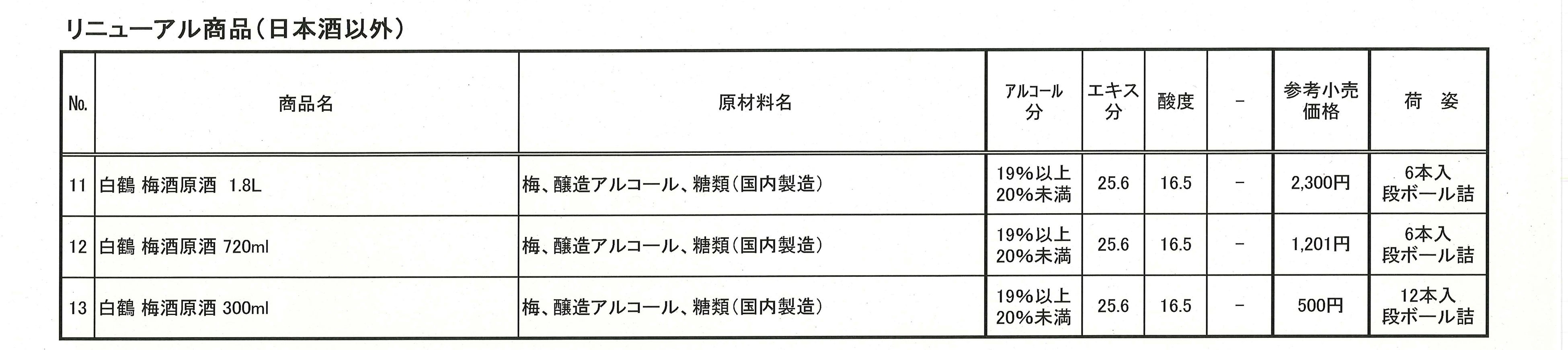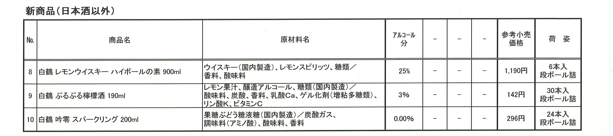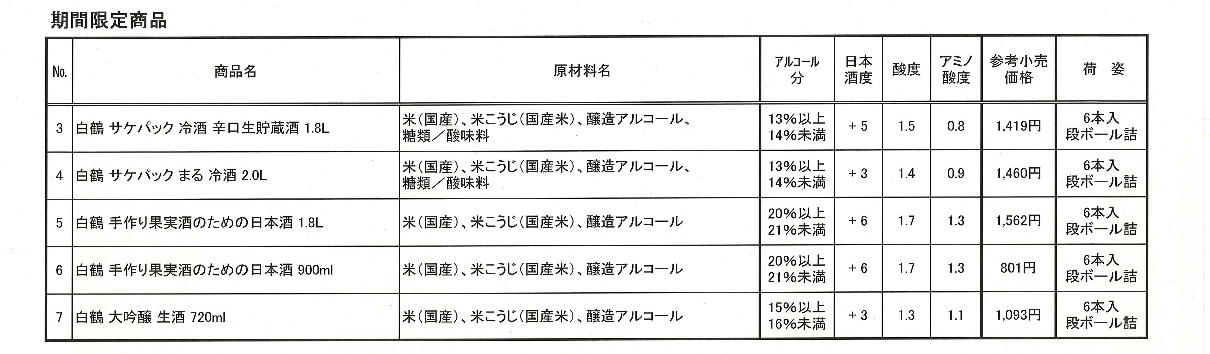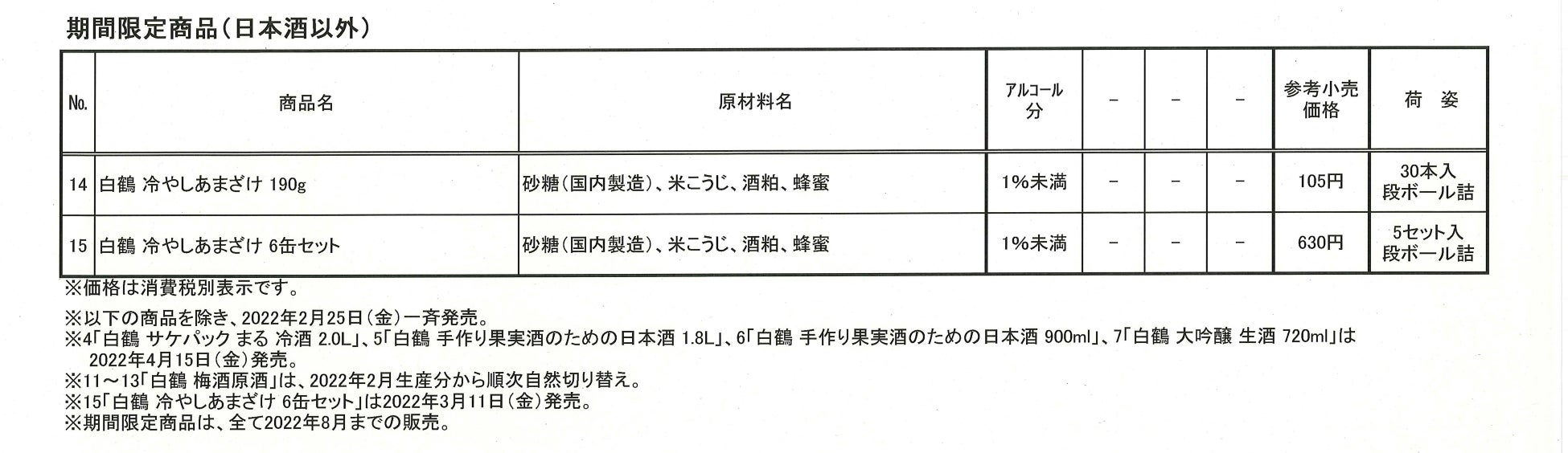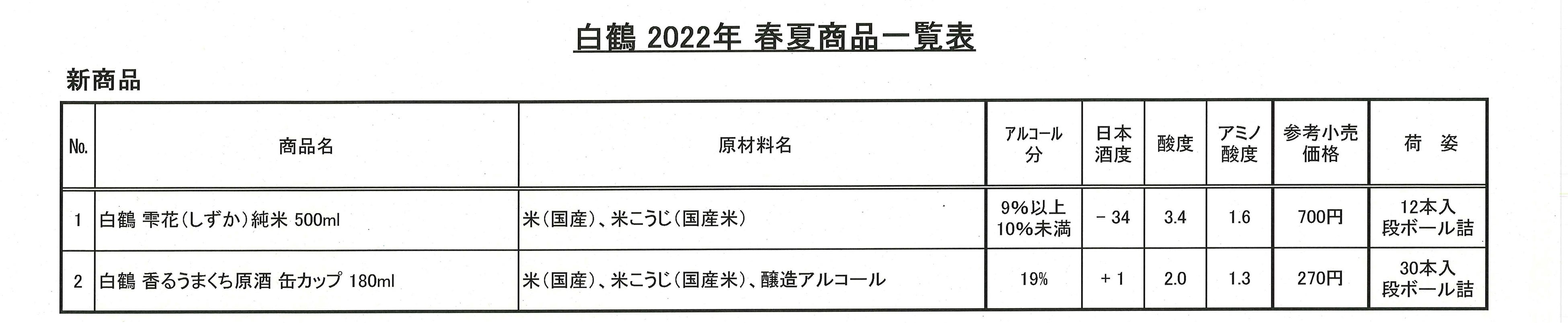詳細は「白鶴2022年 春夏商品一覧表」(画像)をご覧ください。