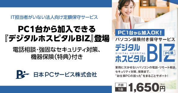 デジタル機器の設定・トラブル解決を行う日本PCサービス株式会社(本社:大阪府吹田市、代表取締役社長:家喜 信行、証券コード:6025、以下「当社」)は、法人からの保守ニーズの増加を受け、スモールビジネス向け新サービス『デジタルホスピタルBIZ』を2024年10月1日(火)より提供開始します。企業規模を問わず、ビジネスシーンで不可欠なパソコンなどのサポートニーズに対応すべく、定額でIT環境をまとめてサポートします。新サービスは、PC1台から加入ができるため、企業や事業所単位だけでなく、特定のPCや部署でサービスを利用いただくことが可能です。