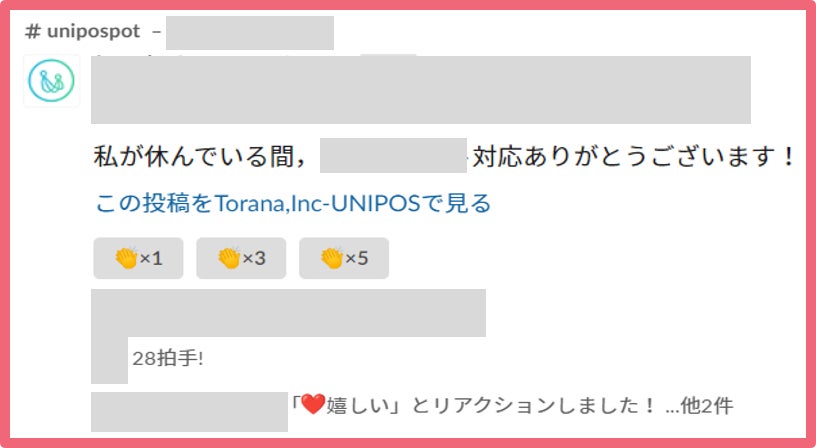・育児関連の休暇もSlack上での共有でOK。「お大事に」などスタンプコミュニケーションも実施。