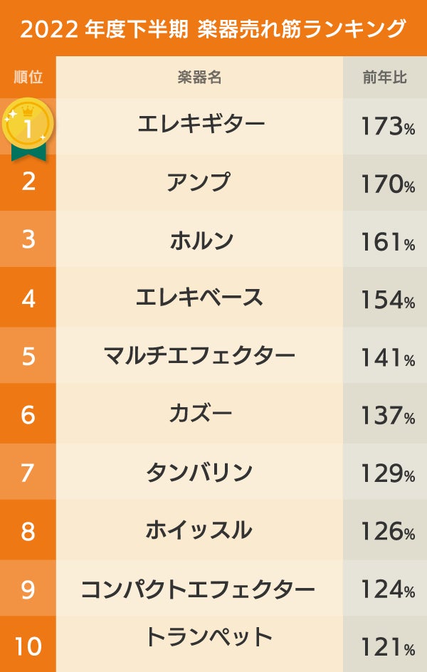 コロナ禍からの復調傾向として、吹奏楽需要が戻り、昨年に引き続き、管楽器が好調。今回はホルンとトランペットがランクイン。