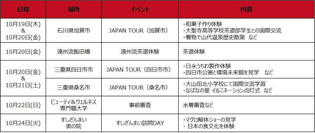 『ミス・ビジット・ジャパン観光特使』 と任命されたミスたちは、各地で日本の伝統文化や日本食の体験、また日本の学生や青少年と交流をするなど様々な活動を行っています。その様子や日本の魅力をSNSなど自身の発信力を活かし、世界へ積極的に発信しています。