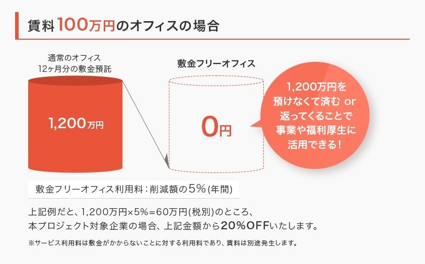 2023年4月30日までにお問い合わせいただいた企業限定で、新規入居や移転、さらには現在入居しているオフィスで既に支払っている敷金を戻してもらうといった2つの敷金の減額サービスの利用料を20%OFFにいたします。