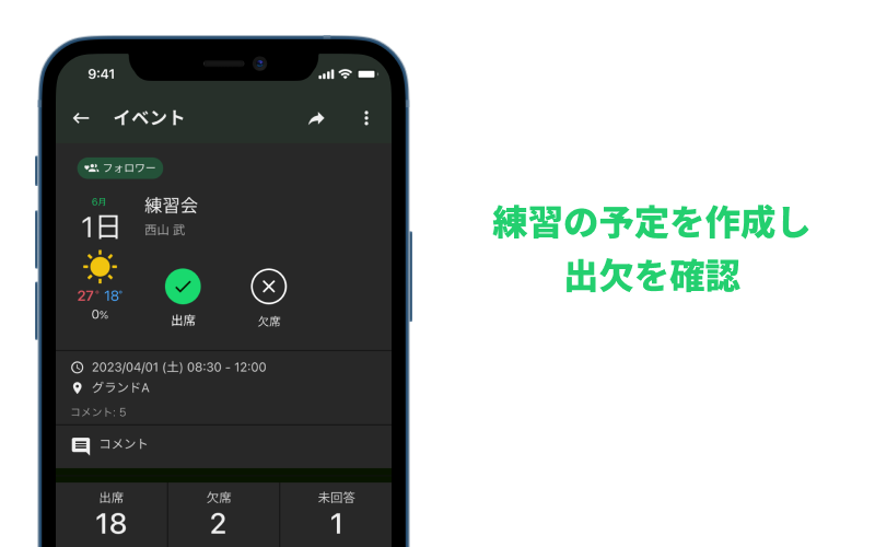 チーム内連絡からスコア管理(チーム/個人)、出欠確認、用具の管理といった、スポーツチーム管理に必要な機能に加え、動画投稿・視聴、対戦相手探しなど、チームスポーツの活動を充実させる機能が網羅されています。管理者が日頃感じているチーム運営の課題を取り除き、チームスポーツをより楽しく、より活発に継続することを可能にしています。