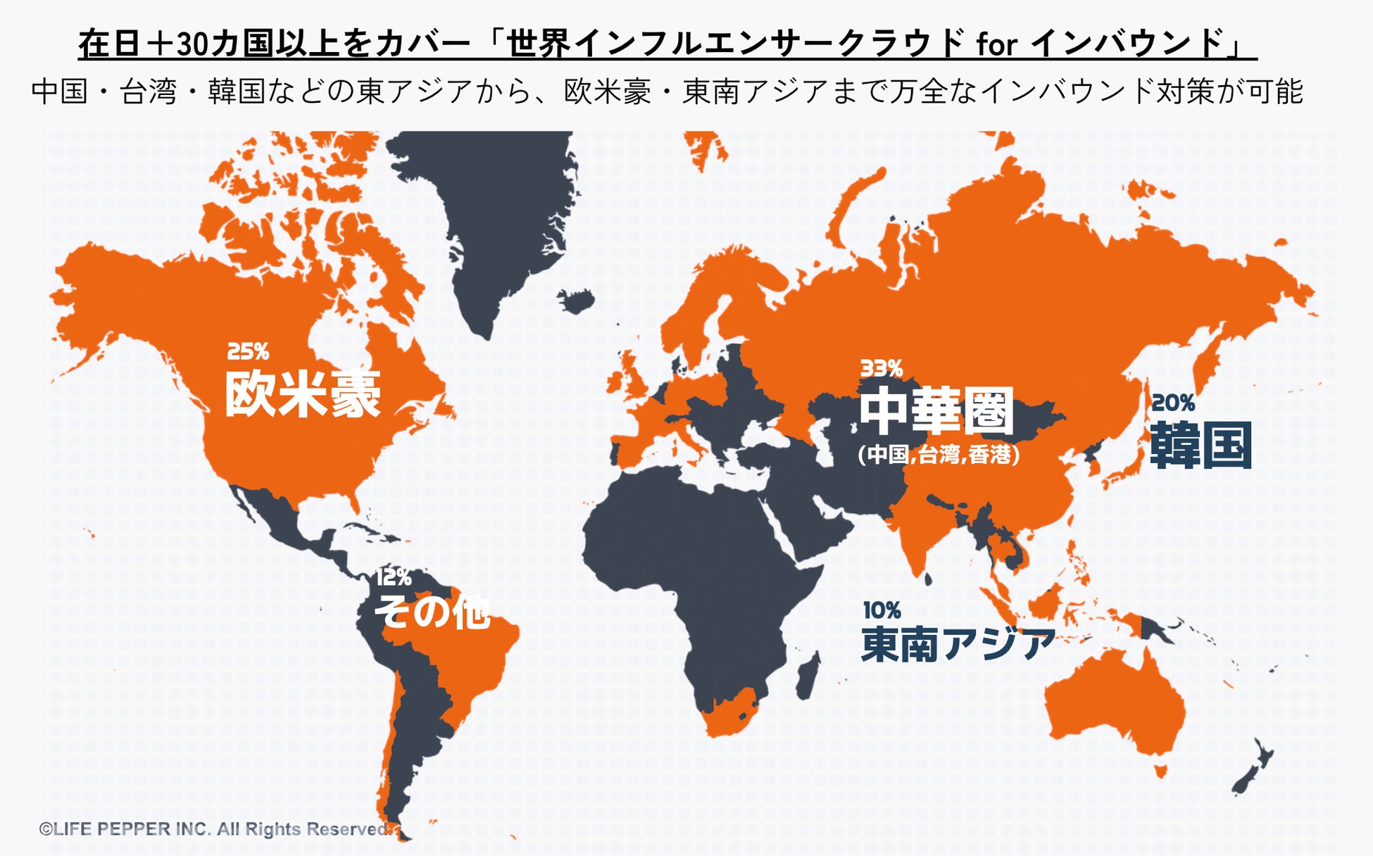 アメリカ、フランスをはじめとする欧州圏、インバウンドで人気の根強い中国・台湾・シンガポールなどの「大中華文化圏」、東南アジア、韓国 など、世界30ヵ国以上のインフルエンサーを利用可能