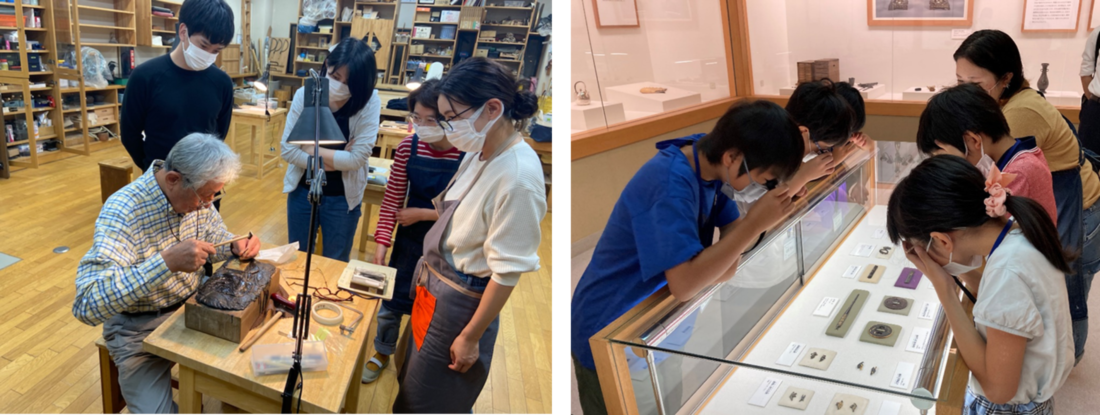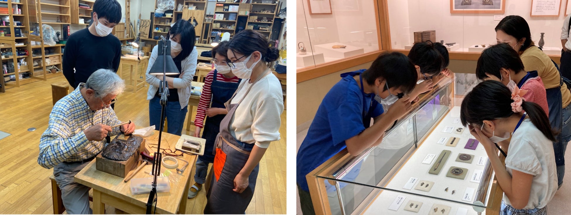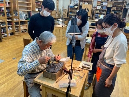 1998年からは伝統技法の習得を目的に、金沢市から委託を受けて「加賀象嵌・彫金専門塾」を運営。重要無形文化財「彫金」保持者(人間国宝)の中川衛氏をはじめとする加賀象嵌作家が講師を務めています。塾生は技術力や経験年数によってコースに分かれて、最大6年間の研修に励みます。広く市民から受講者を募集し、2023年は9名が入塾しました。